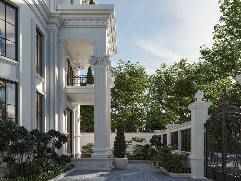 จุดเด่นของการต่อเติมอยู่ที่บัวผนังและรายละเอียดสถาปัตยกรรมที่เพิ่มมิติให้บ้านโดดเด่น ประตูหน้าและมุมหน้าบ้านช่วยสะท้อนรสนิยมและฮวงจุ้ยดี การจัดสวนแบบอังกฤษสร้างบรรยากาศร่มรื่น มีมิติ และเฟอร์นิเจอร์ภายนอกบ้านที่จัดวางอย่างหรูหราทำให้ทุกมุมกลายเป็นมุมถ่ายรูป พร้อมทั้งโทนสีคลาสสิกช่วยให้บ้านดูภูมิฐานและลงตัวแบบผู้ดีอังกฤษ