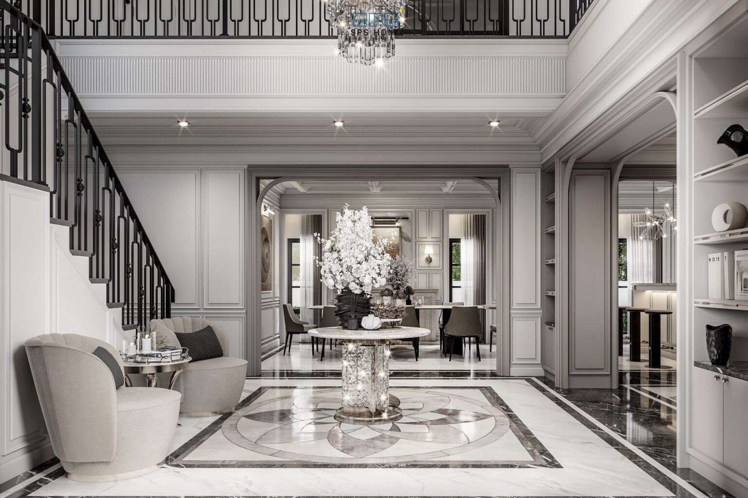 ผนัง: ทาสีใหม่ในโทนสว่าง เช่น ขาว ครีม หรือสีเอิร์ธโทน ช่วยให้บ้านดูกว้างขึ้น หรือใช้วอลเปเปอร์ลายหินอ่อนหรือไม้เพิ่มความหรูหรา