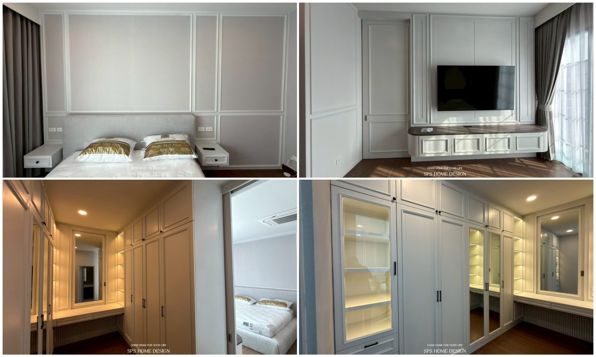 บิ้วอินตู้เสื้อผ้า โต๊ะเครื่องแป้ง และชั้นเก็บของ พร้อมระบบไฟซ่อน (Indirect Lighting) ช่วยให้ห้องดูหรู มีมิติ และใช้งานสะดวก