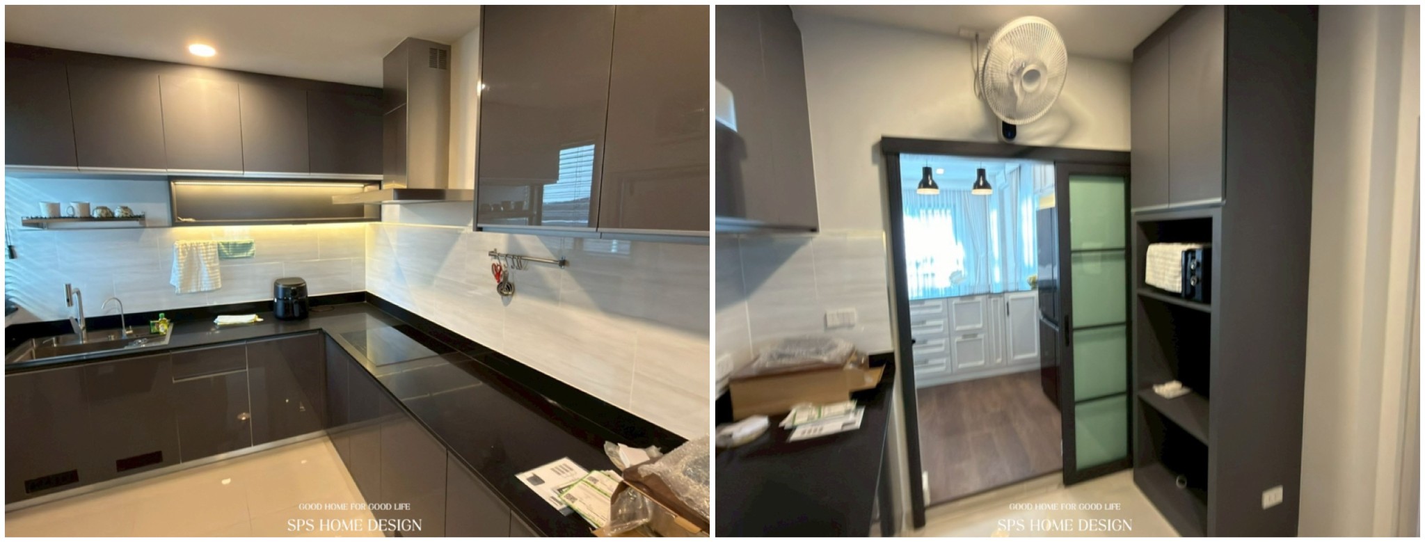 บิ้วอินตู้ครัวและช่องเก็บของรอบห้อง ช่วยเพิ่มพื้นที่จัดเก็บ และทำให้ครัวดูเป็นระเบียบ เเละใช้ท็อปลามิเนตทั้งหมด ให้ผิวสัมผัสเรียบ เงา ดูหรู และดูแลรักษาง่าย