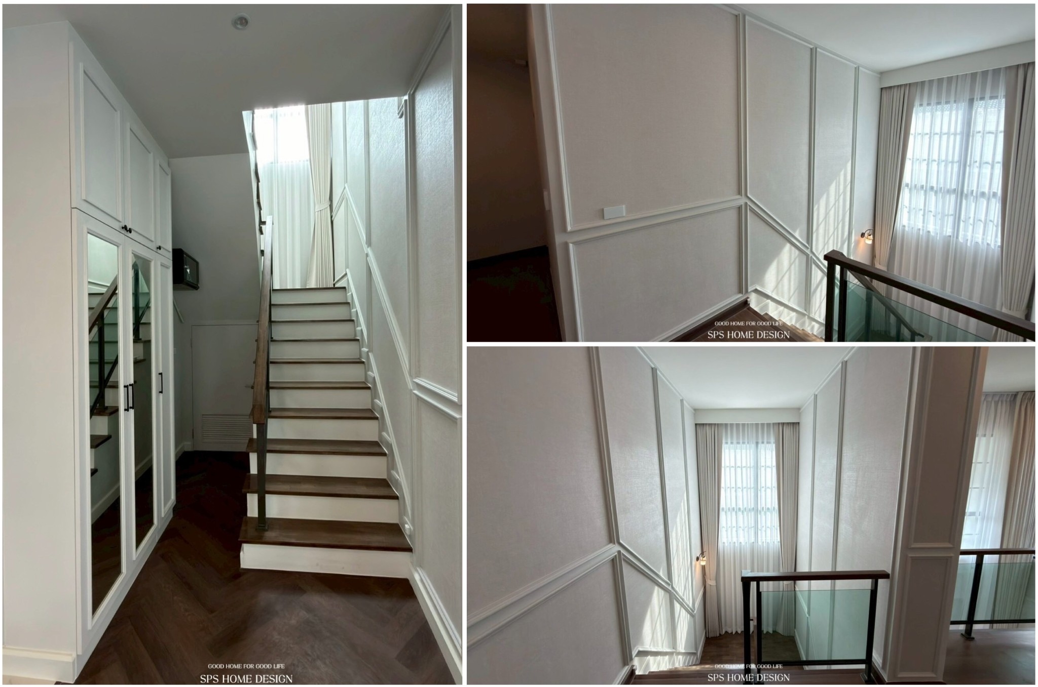โซนบันไดของบ้านหลังนี้ เน้นปรับงานตกแต่งให้ดูเรียบร้อยและหรูขึ้น โดย ไม่ได้รื้อโครงสร้างเดิมของบ้าน เป็นอีกจุดที่แม้จะบิ้วอินไม่เยอะ แต่ช่วยยกระดับภาพรวมของบ้านให้ดูแพงและลงตัวมากขึ้นครับ