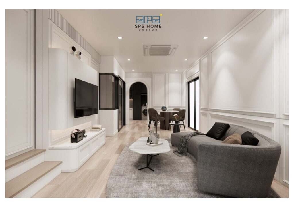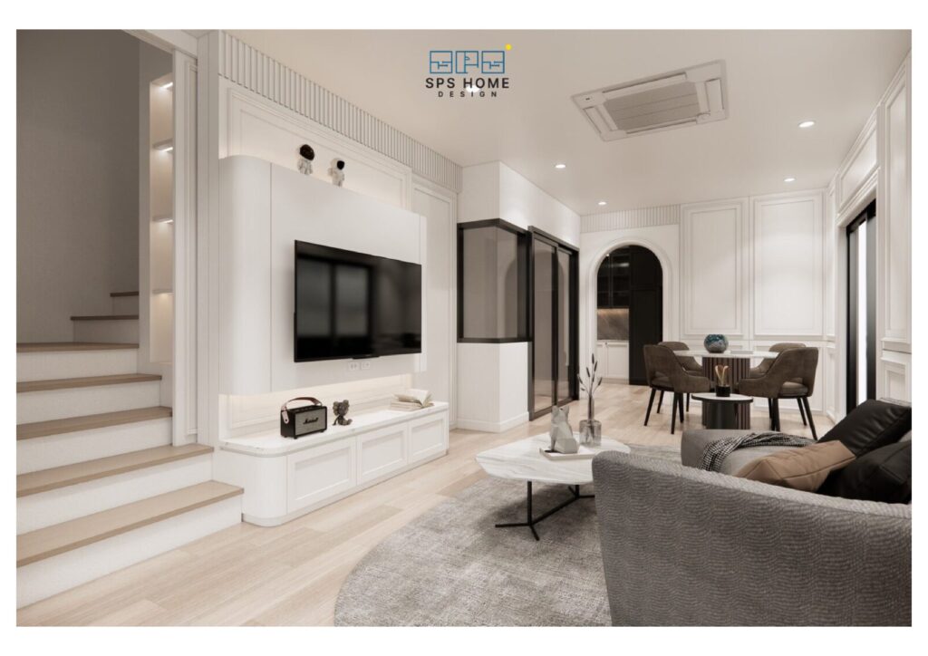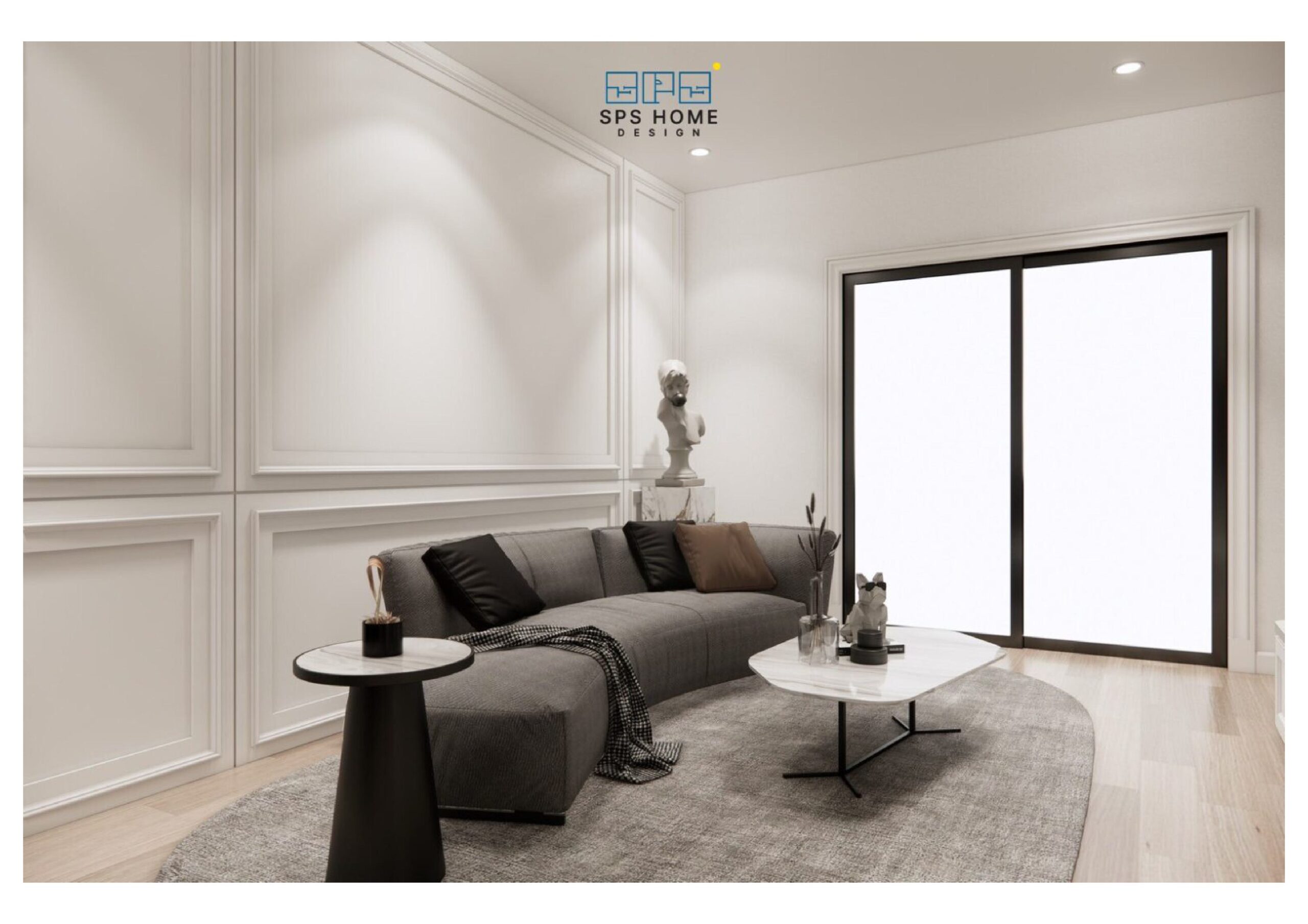 ห้องนั่งเล่นนี้ถ่ายทอดบรรยากาศของความเรียบหรูสไตล์มินิมอลคลาสสิคได้อย่างลงตัว ด้วยโทนสีขาวและน้ำตาลอ่อนที่ให้ความรู้สึกสว่าง โปร่ง และอบอุ่นในเวลาเดียวกัน การเลือกใช้แผงผนังตีบัวขาวตลอดทั้งห้อง เสริมด้วยเส้นสายคมชัดแบบคลาสสิค ทำให้แม้ดีไซน์จะดูเรียบ แต่ยังแฝงความประณีตและมีชั้นเชิง ผสมกับเฟอร์นิเจอร์ทรงโค้ง เส้นสายโฟลวอ่อนโยน จึงช่วยปรับสมดุลให้ห้องนี้ดูละมุนขึ้น และน่าใช้งานในทุกช่วงเวลา