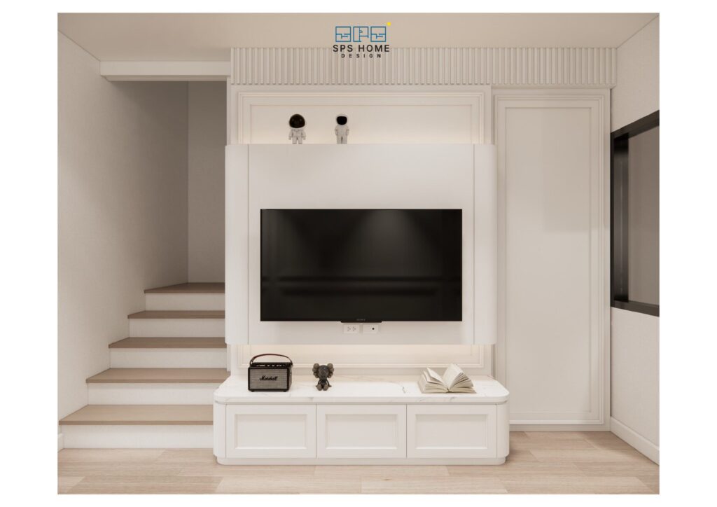 ผนังทีวีออกแบบด้วยงานบิ้วอินโทนขาวเรียบ แต่เพิ่มลูกเล่นด้วยเส้นโค้งด้านข้างให้ดูนุ่มนวลมากขึ้น พร้อมซ่อนไฟ LED ด้านหลังแผง เพื่อสร้างแสงเงาให้ผนังมีมิติโดยไม่ต้องใช้ของตกแต่งเยอะ -
