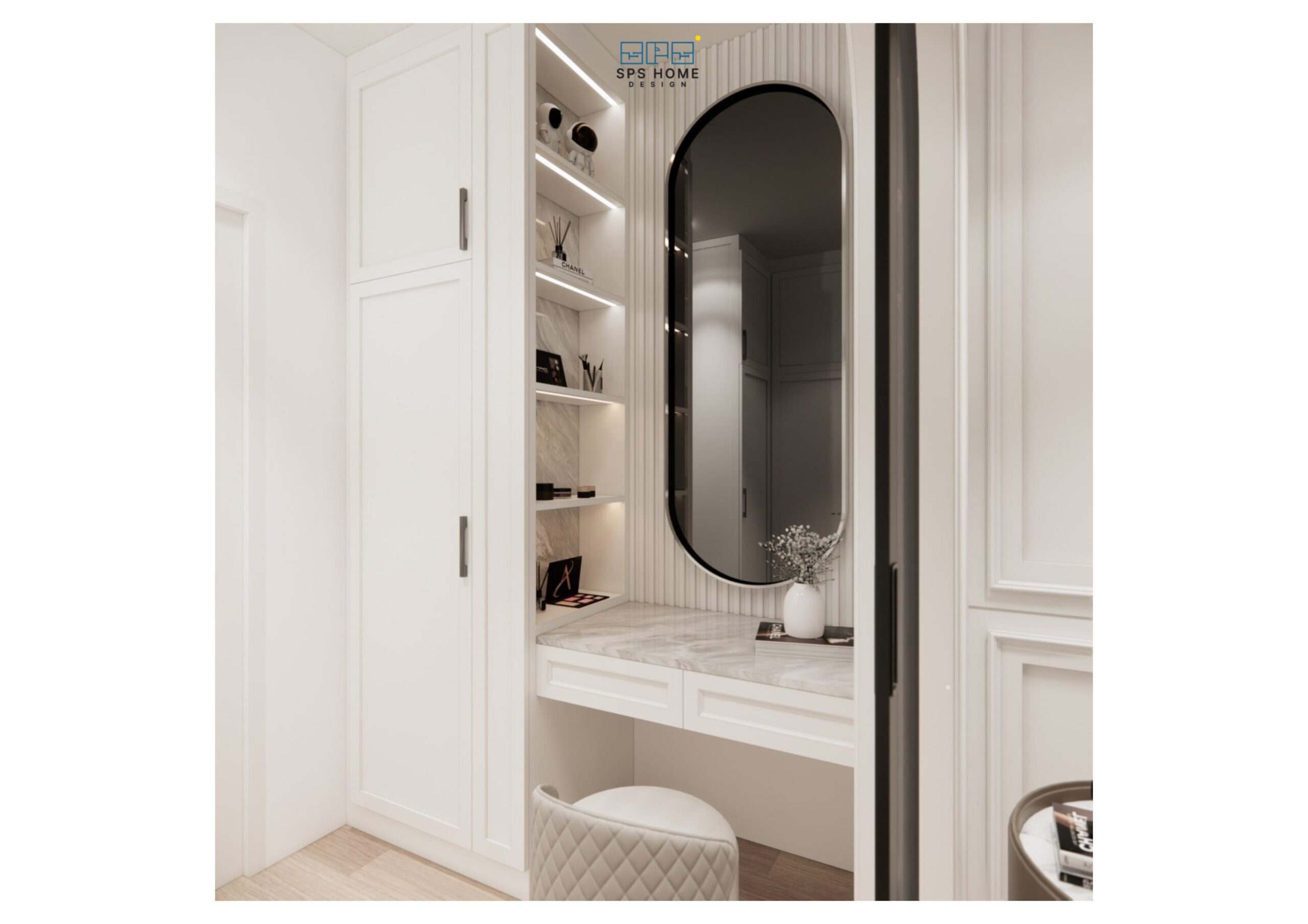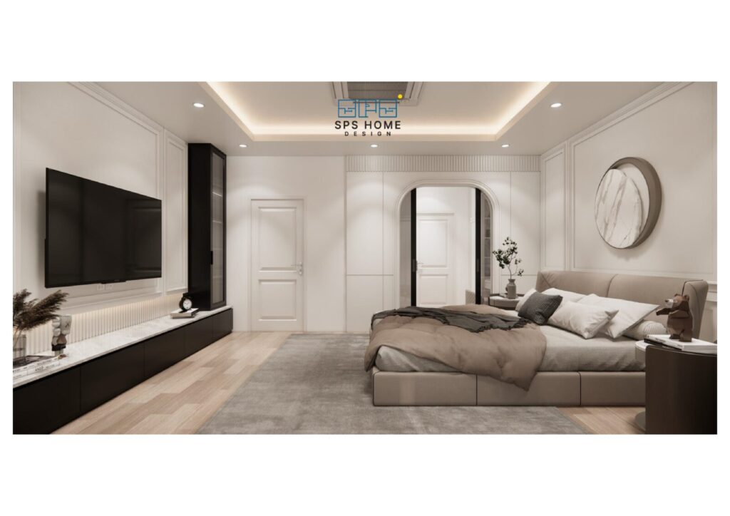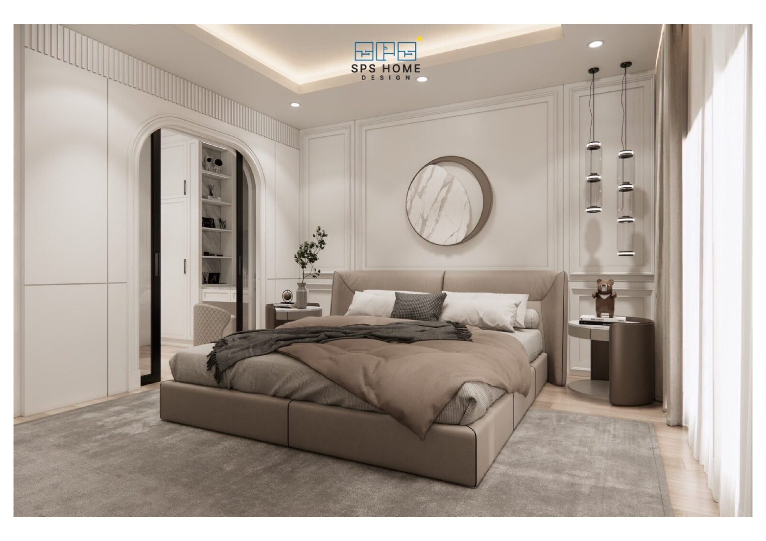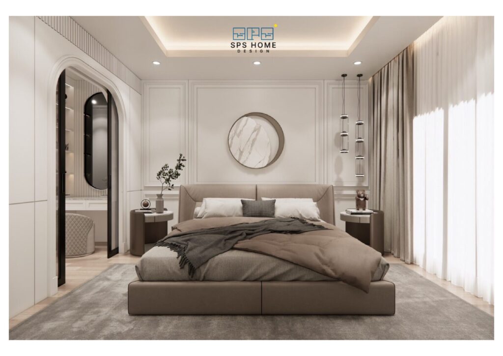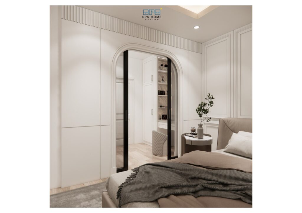 ห้องนอนนี้ถ่ายทอดอารมณ์แบบ “Minimal Luxury” ได้อย่างลุ่มลึก ด้วยโทนสีขาว ครีม และน้ำตาลอ่อนที่สื่อถึงความอบอุ่น สงบ และมีระดับ ผนังหัวเตียงที่กรุด้วยบัวและแผงไม้ช่วยสร้างจังหวะสายตา ทำให้ห้องดูมีมิติแต่ยังคงความละมุน ตำแหน่งของเตียงที่จัดวางให้รับแสงธรรมชาติตรงๆ ยิ่งเติมบรรยากาศให้ดูสบาย ผ่อนคลาย และเหมาะกับการพักผ่อนอย่างแท้จริง เป็นห้องที่มีทั้งฟังก์ชัน ความสวยงาม และความรู้สึกที่ดีแบบครบถ้วน