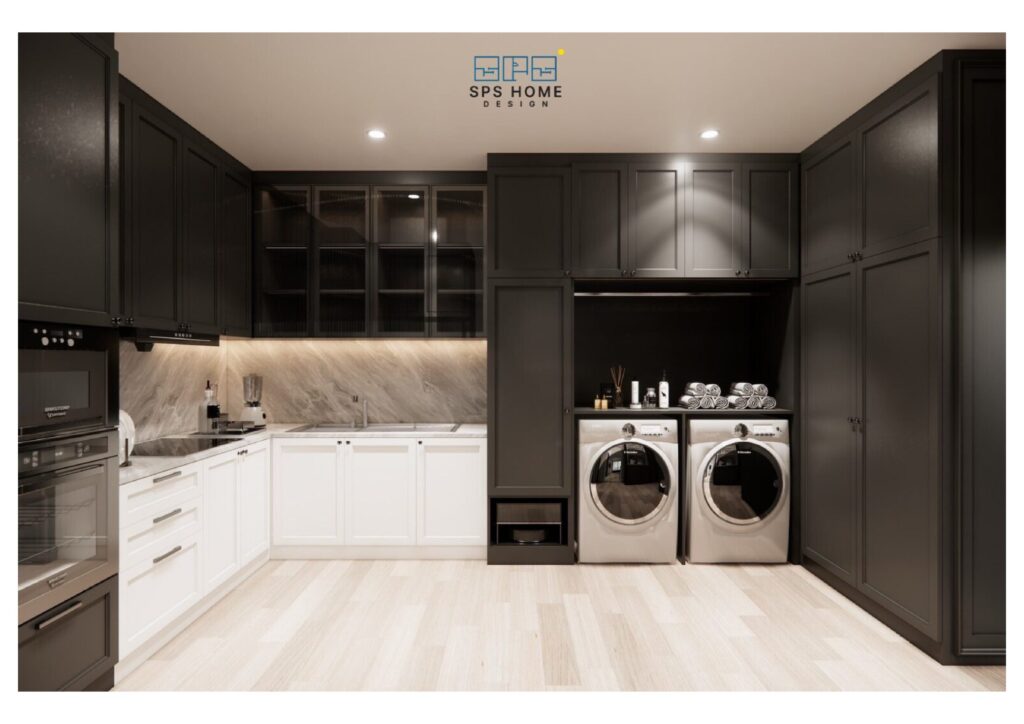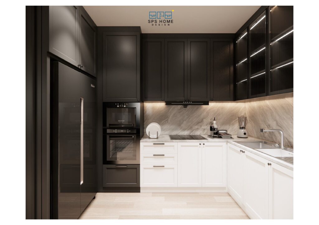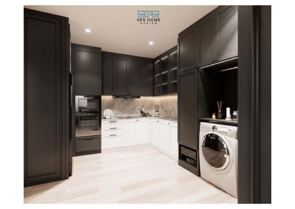 ห้องครัวนี้ออกแบบภายใต้แนวคิด “คลาสสิกเข้มขรึมในบรรยากาศเรียบหรู” โดยเลือกใช้โทนสีดำด้านตัดกับสีขาวอย่างมีชั้นเชิง เพื่อเน้นเสน่ห์ของความขรึมและความสะอาดในพื้นที่เดียวกัน ผนังและท็อปเคาน์เตอร์ลายหินธรรมชาติเพิ่มมิติความหรูหรา และช่วยเบรกความเข้มของสีดำไม่ให้ดูทึบจนเกินไป เมื่อรวมกับแสงไฟ Warm White แบบซ่อนใต้ตู้ ให้บรรยากาศอบอุ่น นุ่มนวลแต่ยังดูหรู และสร้างความรู้สึกเป็นมืออาชีพอย่างมีรสนิยมในการประกอบอาหารทุกมื้อ