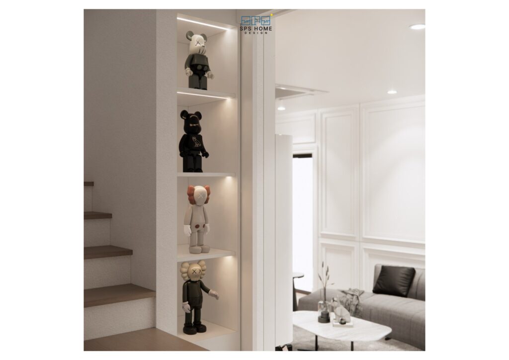 มุมข้างบันไดบิ้วอินเป็นช่องโชว์ของสะสม พร้อมติดไฟในแต่ละชั้น ช่วยใช้พื้นที่แนวตั้งให้คุ้มค่า และยังเติมคาแรกเตอร์ให้ห้องดูน่าสนใจแบบมีชีวิต -