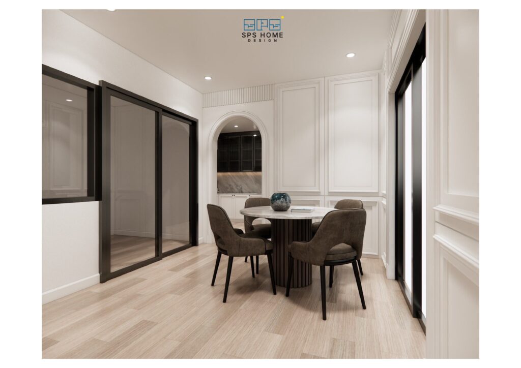ห้องทานอาหารนี้ถูกออกแบบให้คงความเรียบหรูในแบบมินิมอลคลาสสิค โดยเน้นใช้โทนสีขาวเป็นหลัก เสริมด้วยพื้นไม้โทนอ่อนเพื่อสร้างความรู้สึกอบอุ่นและเป็นกันเอง บรรยากาศโดยรวมดูโปร่ง สะอาดตา และไม่อึดอัด ด้วยการจัดแสงไฟแบบซ่อนแหล่งกำเนิด และเลือกใช้เฟอร์นิเจอร์ทรงโค้ง เช่น โต๊ะกลมและเก้าอี้บุผ้ากำมะหยี่ที่ให้สัมผัสนุ่มนวล ทั้งหมดนี้ผสมผสานความเป็นทางการกับความผ่อนคลายได้อย่างสมดุล เหมาะสำหรับมื้ออาหารทั้งในชีวิตประจำวันและการต้อนรับแขกในบรรยากาศอบอุ่น