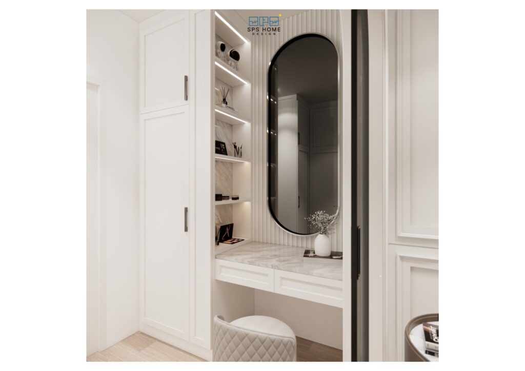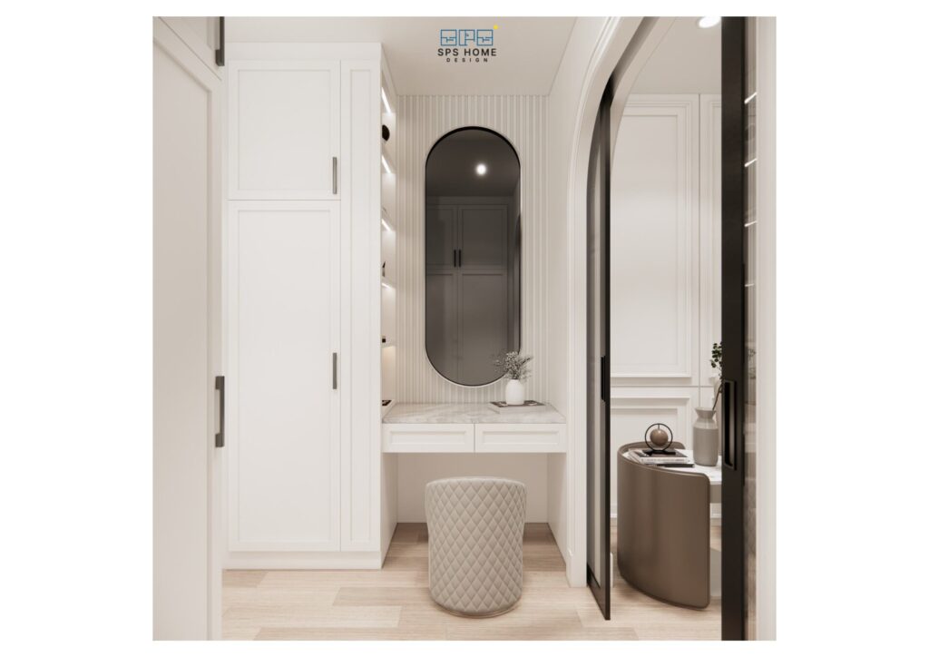 ตู้เสื้อผ้าบิ้วอินถูกออกแบบให้ดูกลืนไปกับผนัง โดยเลือกใช้หน้าบานแบบเรียบไม่มีมือจับ ลดความรู้สึกรกของเส้นสาย และทำให้ห้องดูโปร่งขึ้น -