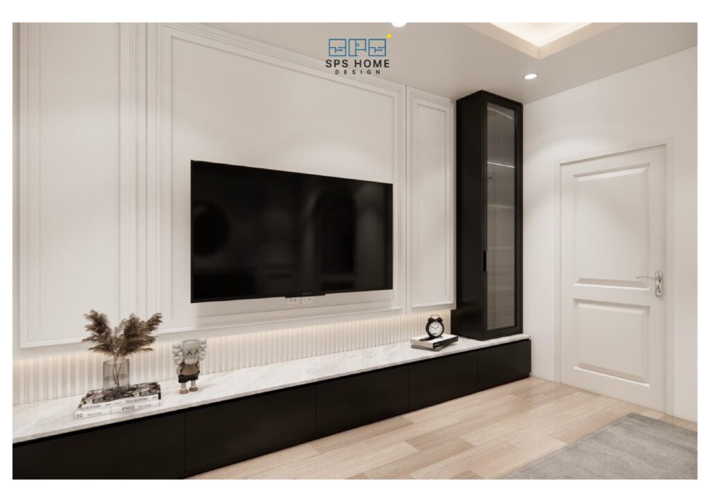 ใช้เทคนิคกรุผนังแบบ Panel Wall พร้อมคิ้วบัวรอบห้อง ช่วยให้ผนังดูมีเลเยอร์และหรูหราแบบไม่ต้องใช้วัสดุฉูดฉาด และยังคุมโทนให้กลมกลืนกับผนังทีวี -
