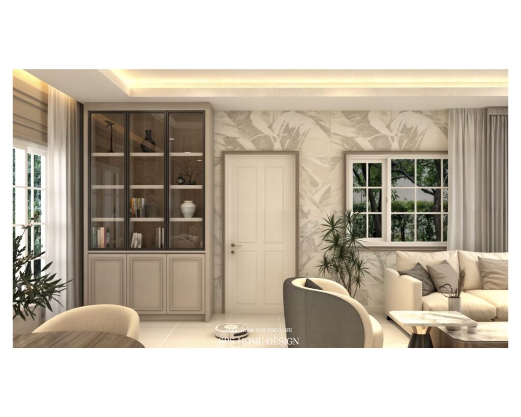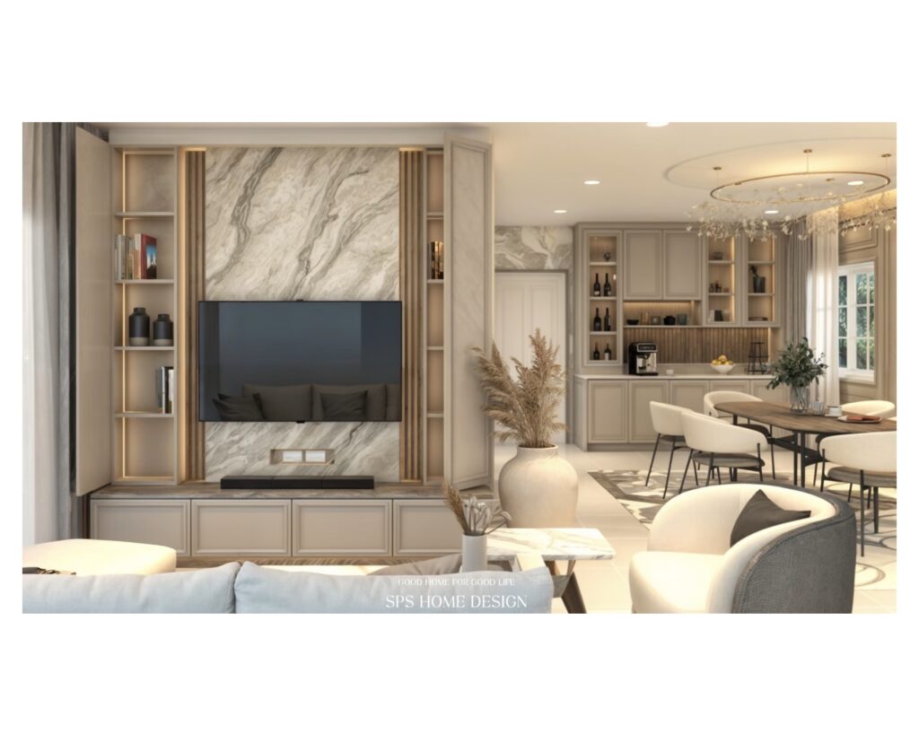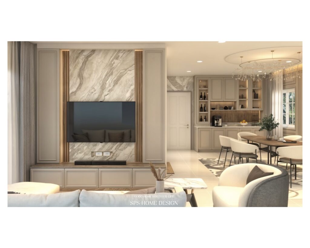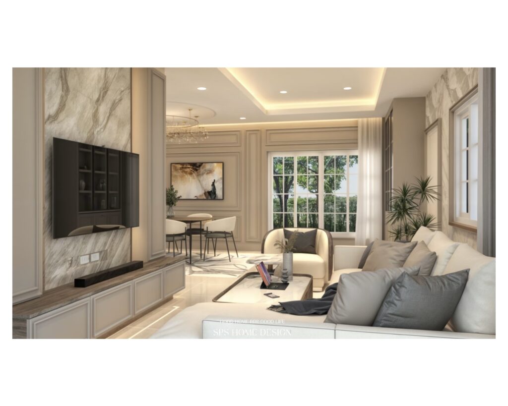 ห้องนั่งเล่นถูกออกแบบในสไตล์ Modern Classic ที่เน้นความเรียบหรูแต่ยังอบอุ่น ลูกค้าต้องการให้เป็นศูนย์กลางของบ้านที่ทั้งสวยงามและใช้งานได้จริง โทนสีหลักเลือกเป็นสีเบจผสมเทาอ่อน ตัดกับลายหินอ่อนธรรมชาติที่ช่วยสร้างความหรูหรา เสริมด้วยไฟซ่อนให้บรรยากาศดูนุ่มนวล อบอุ่น และเหมาะกับการพักผ่อนร่วมกันของครอบครัว