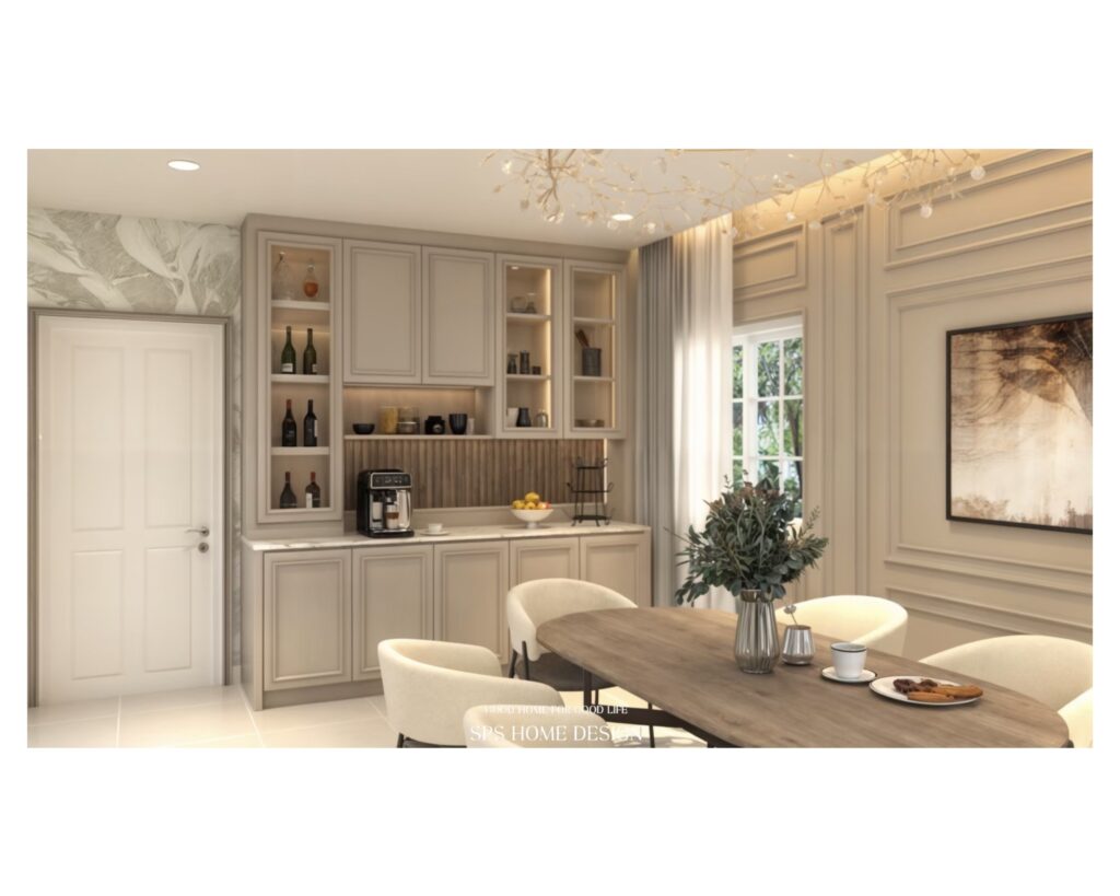 โซนทานข้าวถูกออกแบบให้เป็นพื้นที่กึ่งกลางระหว่างห้องนั่งเล่นและครัว ด้วยคอนเซปต์ Modern Classic ที่เน้นความหรูหราเรียบง่าย แต่ยังแฝงด้วยความอบอุ่นเพื่อรองรับการใช้งานจริงในชีวิตประจำวัน ลูกค้าต้องการพื้นที่สำหรับสังสรรค์และรับประทานอาหารร่วมกับครอบครัวและแขกที่มาเยือน ดังนั้นจึงเลือกใช้โทนสีเบจอ่อนที่ดูสุภาพ สบายตา และเสริมบรรยากาศให้มื้ออาหารเต็มไปด้วยความผ่อนคลาย พร้อมด้วยแสงไฟโทนอุ่นที่ช่วยสร้างความรู้สึกเป็นกันเองมากยิ่งขึ้น