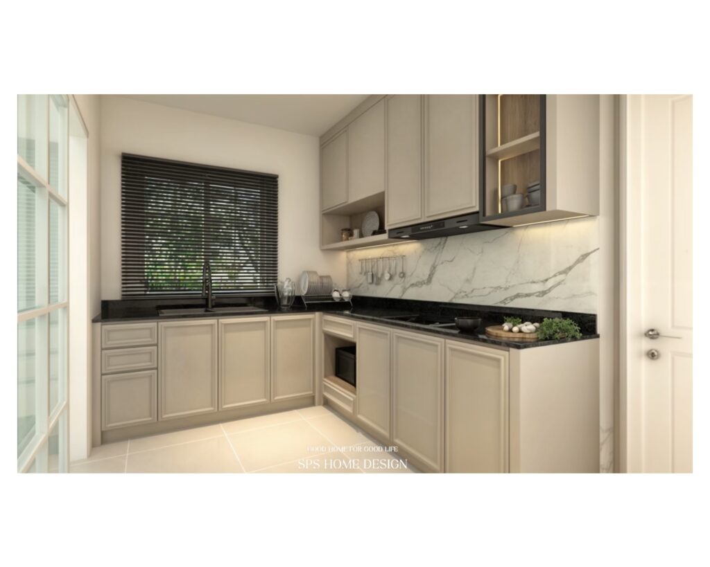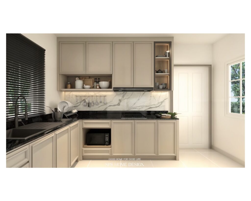 ห้องครัวนี้ถูกออกแบบในสไตล์ Modern Classic ที่ผสมผสานความหรูหราและความเรียบง่ายเข้าด้วยกัน ลูกค้าต้องการครัวที่ใช้งานได้จริงสำหรับทำอาหารในทุกวัน แต่ในขณะเดียวกันก็ต้องการบรรยากาศที่สวยหรู ดูสะอาดตา และเข้ากับโทนรวมของบ้าน โทนสีเบจอ่อนจับคู่กับท็อปหินสีดำและผนังหินอ่อนลายธรรมชาติ ทำให้ห้องครัวดูโมเดิร์นและทันสมัย โดยยังคงความอบอุ่นและน่าใช้งาน
