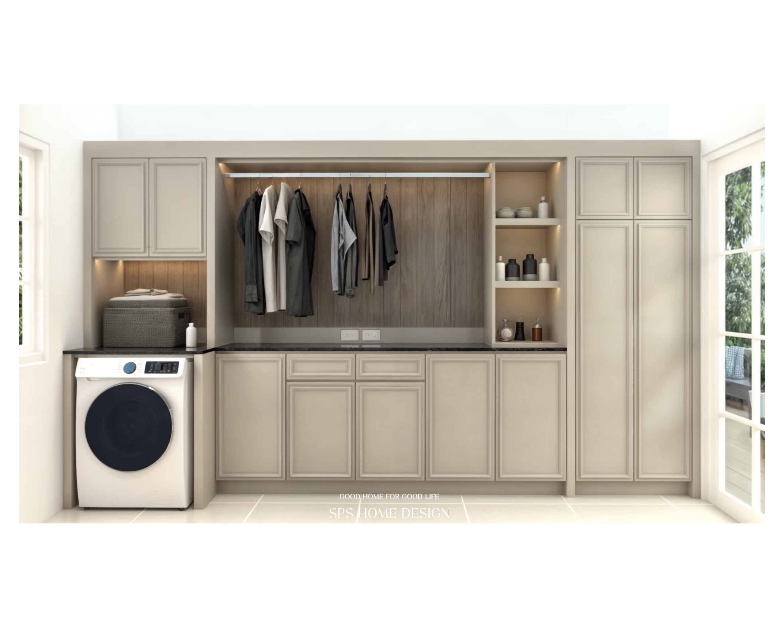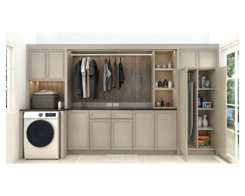 พื้นที่โซนซักผ้าและตู้เก็บของนี้ถูกออกแบบมาเพื่อตอบโจทย์การใช้งานจริงในชีวิตประจำวัน แต่ยังคงคอนเซปต์ Modern Classic ที่ดูเรียบร้อย หรูหรา และสะอาดตา ลูกค้าต้องการให้โซนนี้เป็นทั้งพื้นที่ซักผ้าและพื้นที่เก็บของใช้ในบ้านให้ครบจบในที่เดียว โดยจัดวางให้ทุกอย่างอยู่เป็นสัดส่วน ใช้งานสะดวก และดูกลมกลืนไปกับดีไซน์รวมของบ้าน