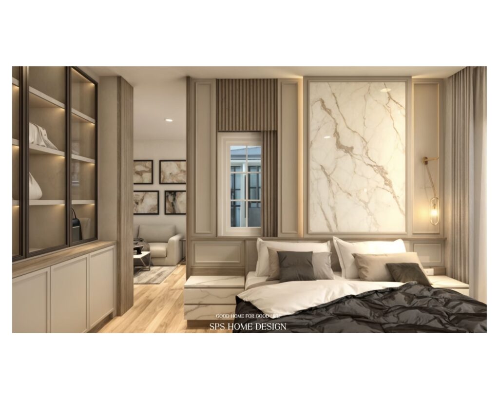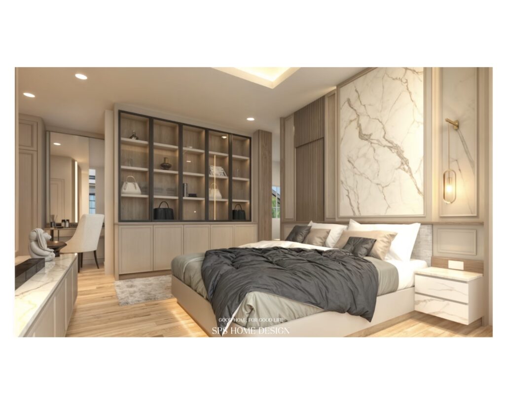 ห้องนอนใหญ่ถูกออกแบบให้เป็นพื้นที่พักผ่อนที่หรูหราและสมบูรณ์แบบที่สุดในบ้าน ลูกค้าต้องการบรรยากาศที่สงบ เรียบหรู แต่ยังคงความอบอุ่นสบาย โทนสีหลักคือสีเบจอ่อนและเทาอ่อน เสริมด้วยลายหินอ่อนบนผนังหัวเตียงที่ช่วยสร้างความโดดเด่นและหรูหราในสไตล์ Modern Classic ทุกดีไซน์ถูกวางอย่างสมดุล ให้ทั้งฟังก์ชันและความสวยงามลงตัวที่สุด
