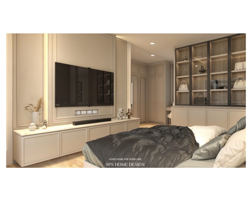ตู้วางทีวี: บิ้วอินตู้ล่างบานลูกฟักสีอ่อน วางต่อเนื่องกับผนังทีวีที่มีกรอบบัวดีไซน์เรียบ ทำให้ห้องนอนดูกลมกลืนและหรูหรามากยิ่งขึ้น