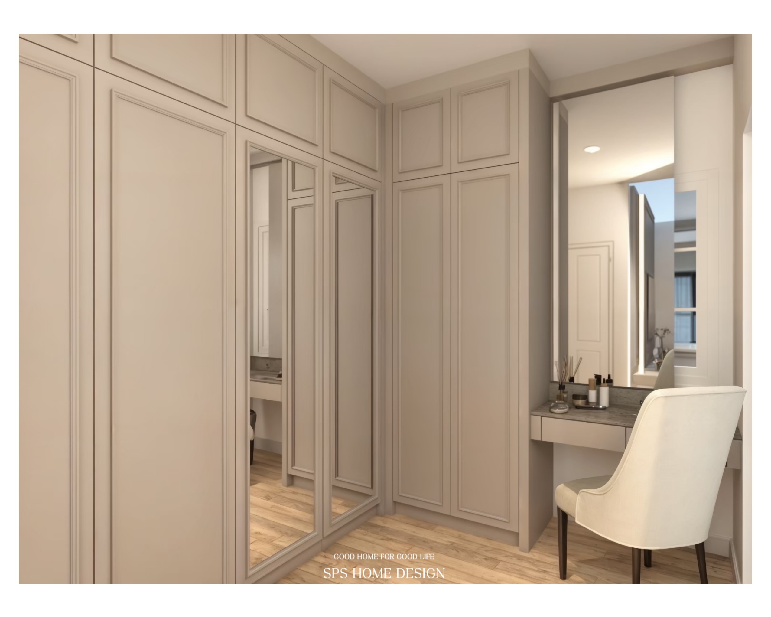 โต๊ะเครื่องแป้ง: ออกแบบเข้ามุม เชื่อมกับตู้เสื้อผ้า เพิ่มความเป็นส่วนตัวและใช้งานได้จริง พร้อมกระจกบานใหญ่ช่วยให้ห้องดูโปร่ง