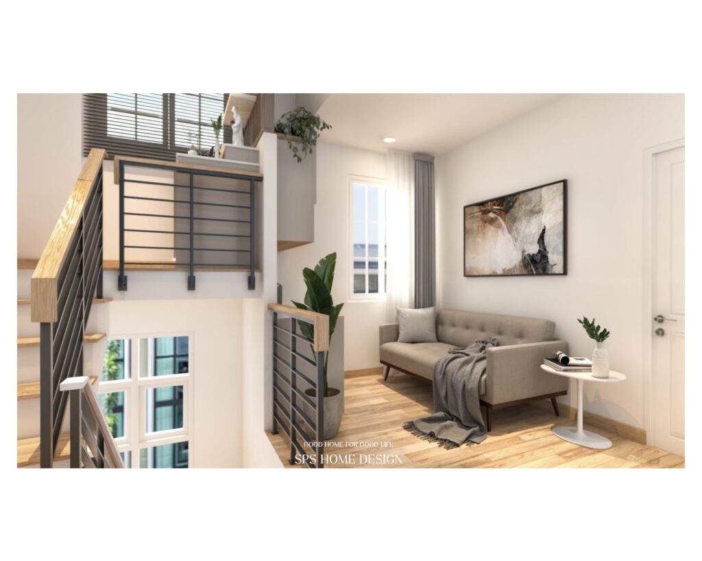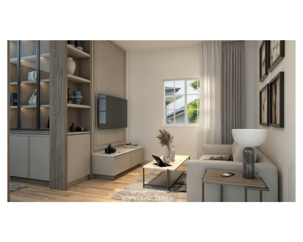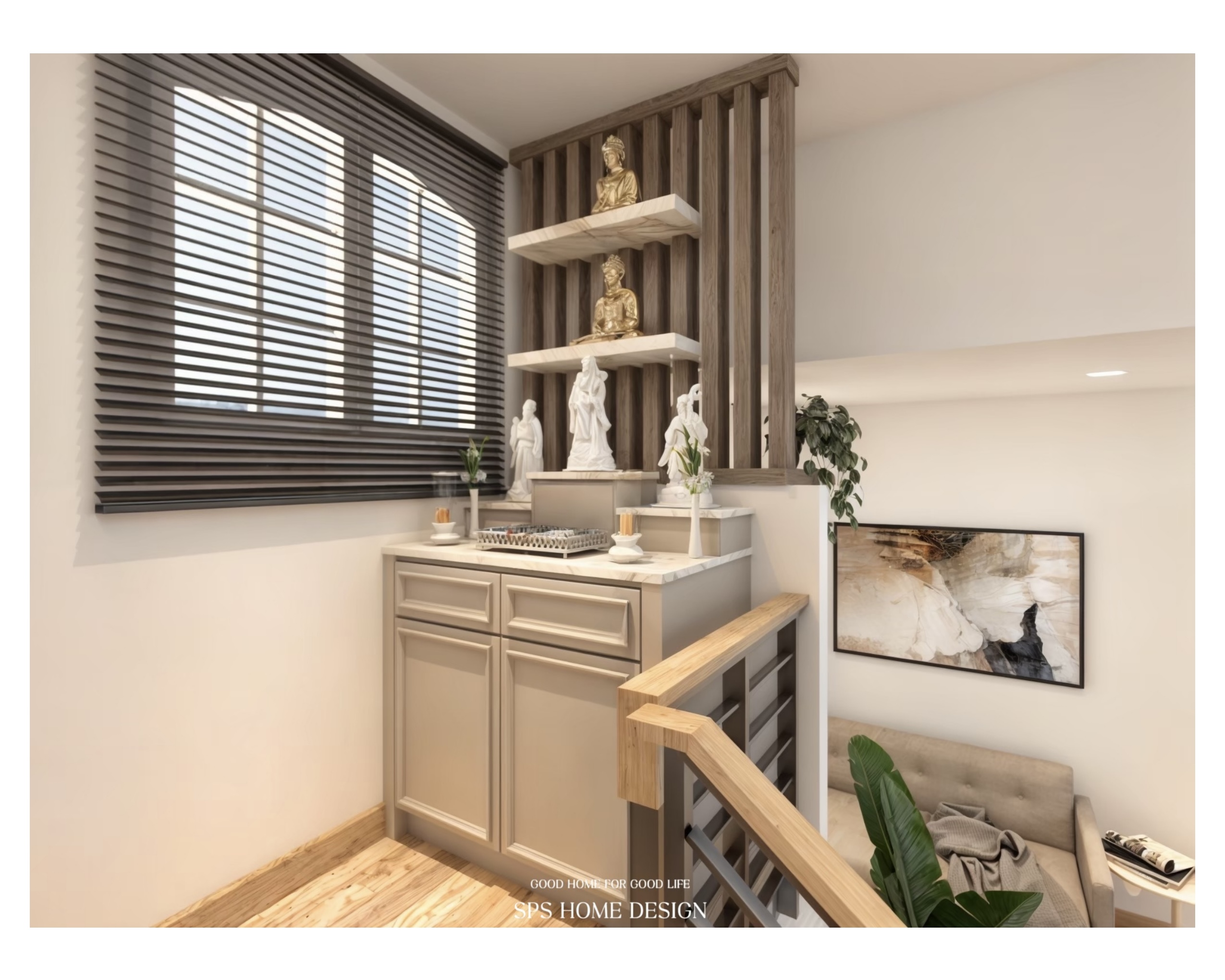 โซนนี้ออกแบบมาเพื่อเป็นทั้งพื้นที่พักผ่อนและพื้นที่ศักดิ์สิทธิ์ของบ้าน ลูกค้าต้องการให้ชั้น 2 มีบรรยากาศที่ผ่อนคลาย ใช้นั่งดูหนังหรือพักเบาๆ ได้ในทุกวัน ขณะเดียวกันก็ตั้งใจให้มีมุมสงบเพื่อวางตู้พระและจัดวางองค์พระพุทธรูปตามหลักฮวงจุ้ยและความเป็นสิริมงคล ภาพรวมจึงออกมาในโทนอบอุ่น เรียบง่าย แต่อบอวลด้วยความสงบและความเป็นระเบียบ