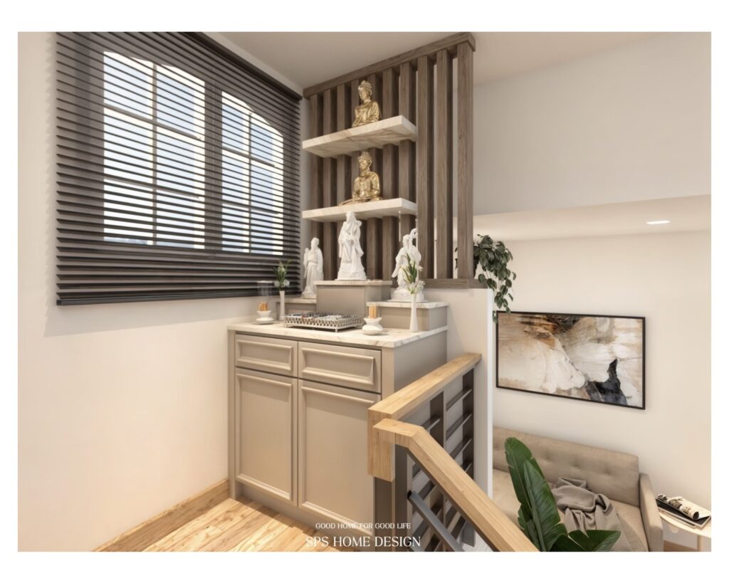 การตกแต่งโดยรวม: เลือกใช้โทนไม้ธรรมชาติผสมสีเบจ ทำให้โซนนี้กลมกลืนกับส่วนอื่นๆ ของบ้าน แต่ยังแยกฟังก์ชันชัดเจนระหว่างการพักผ่อนและการสักการะ