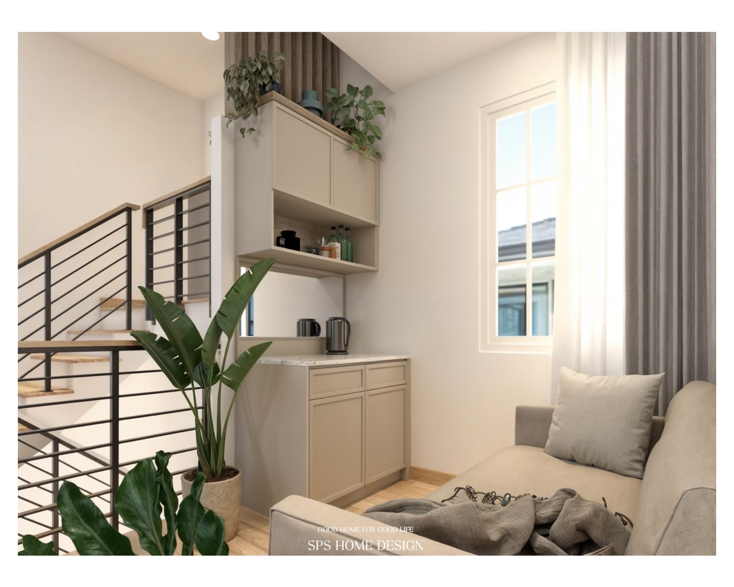 การตกแต่งบ้านหลังนี้ถูกออกแบบโดยยึดหลัก โมเดิร์น มินิมอล ที่เน้นความเรียบง่าย โปร่งโล่ง และมีเส้นสายที่ชัดเจน ทุกองค์ประกอบถูกจัดวางให้สมดุลกันอย่างลงตัว ไม่ว่าจะเป็นโทนสีที่เลือกใช้ เฟอร์นิเจอร์บิ้วอินที่เน้นฟังก์ชันใช้งานจริง รวมไปถึงการออกแบบพื้นที่ให้สอดคล้องกับการใช้ชีวิตประจำวันของเจ้าของบ้าน จุดเด่นคือบรรยากาศที่ให้ความรู้สึกสงบ อบอุ่น และผ่อนคลาย แต่ยังคงแฝงความทันสมัยเอาไว้ได้อย่างชัดเจน